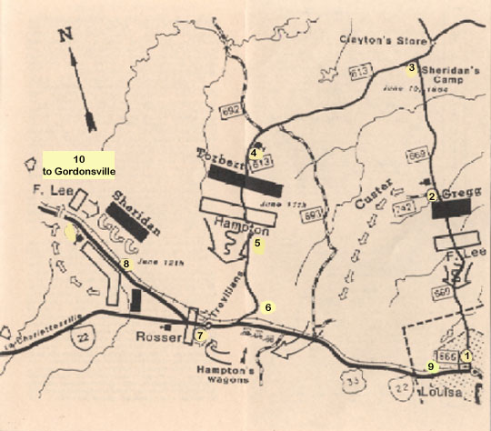 Stop 1: Louisa Courthouse You are standing in the historic town of Louisa Court House (now Louisa). During the Civil War, the Virginia Central Railroad passed through this county seat. The main street became the Gordonsville Road (Rte. 22/33) at the west end of town. The Marquis Road (Rte. 669), named for the Marquis de Lafayette, crossed the railroad several blocks northwest of here. On June 7, 1864, Union Gen. Philip H. Sheridan headed west from Cold Harbor with two of the Army of the Potomac's cavalry divisions. His mission was to destroy the Virginia Central Railroad junctions at Gordonsville, Cobham Station, and Charlottesville, unite with Gen. David Hunter's army, and return to the Army of the Potomac by way of the James River. During Sheridan's absence, the Army of the Potomac slipped across the river to invest the critical crossroads town of Petersburg. Two days after Sheridan departed, Gen. Robert E. Lee sent two divisions of cavalry under Gen. Wade Hampton, of South Carolina, to intercept the raiders and protect Confederate supply lines. About 6,400 troopers with 15 pieces of horse artillery pursued Sheridan's 9,300-man force across Virginia. Both sides suffered from central Virginia's drought and heat wave. By taking a shorter route, Hampton reached Louisa Court House ahead of Sheridan on June 10, 1864, and Gen. Fitzhugh Lee's division camped around the county seat. One of Hampton's brigades bivouacked west of Trevilian Station, the other two at the depot. From the Courthouse proceed West/North on Rt. 33/22 and, just past the gas station on the right, cross the railroad tracks and head north on Rt. 669/Ellisville Drive for approximately 8/10 (.8) miles. There is a VCWT marker on the left at the entrance to a garage.